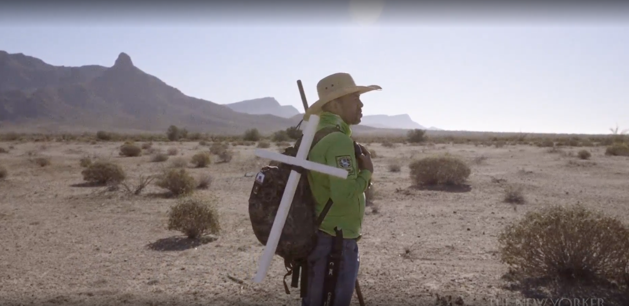The film follows the Águilas as they search for missing strangers that one volunteer calls “nuestros migrantes”—our migrants. They are armed with tenderness but also tools: work boots, vests hung heavy with binoculars and cameras, floppy-brimmed hats. They tote metal walking sticks and two-way radios that crackle with reports of discoveries after searchers fan out to pinpointed coördinates. Here there is no cell service except on particularly high ground, and, without adequate preparation, the volunteers could find themselves as lost as the people whom they’re seeking, a grave risk given the heat. “In the desert, nature becomes a lethal weapon,” Zubiaurre said.